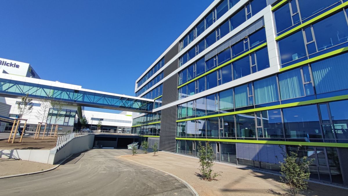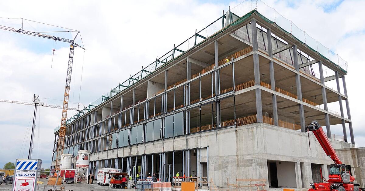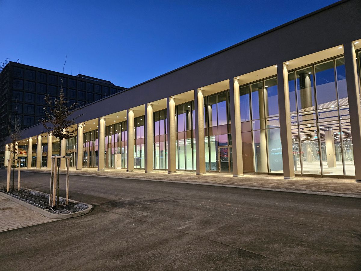 Auftrag Blechfassade: ca. 650m². Pfostenriegelfassade: ca. 4200m². Stahlfassade: ca. 900m².
