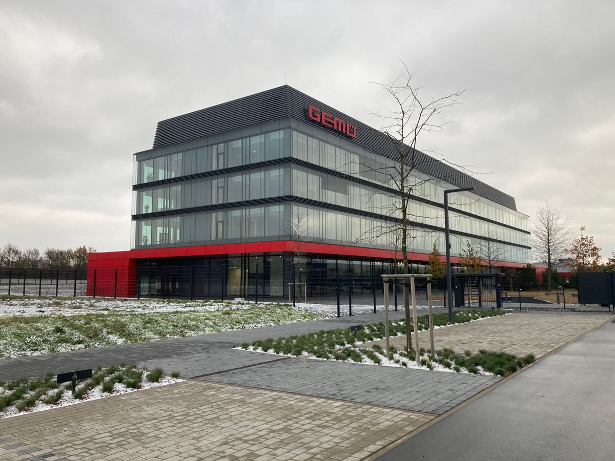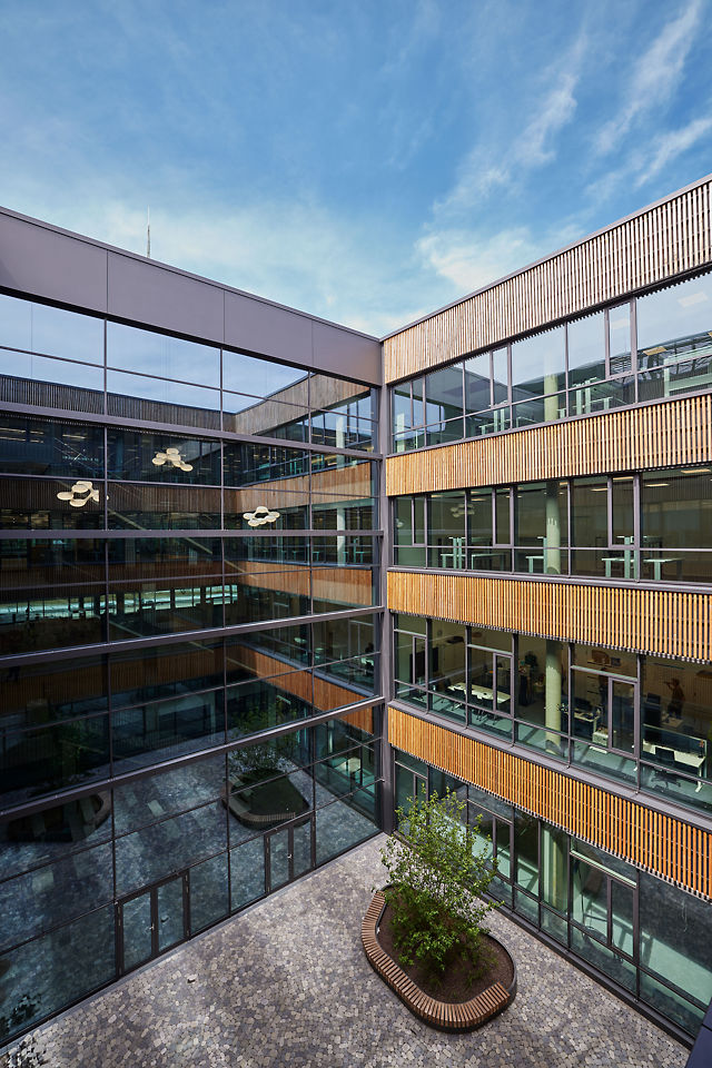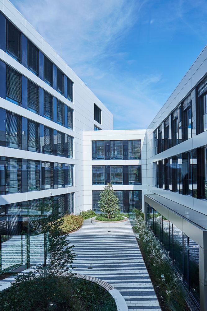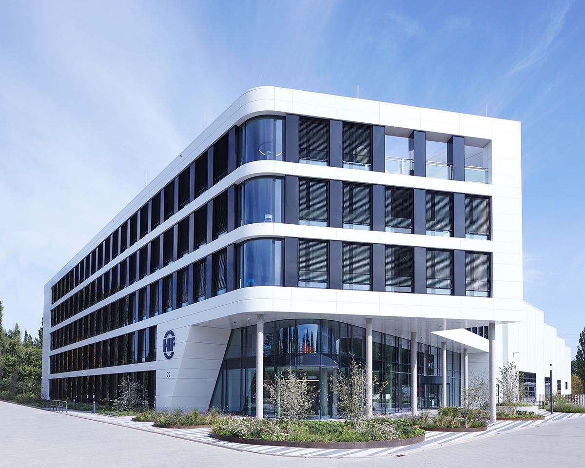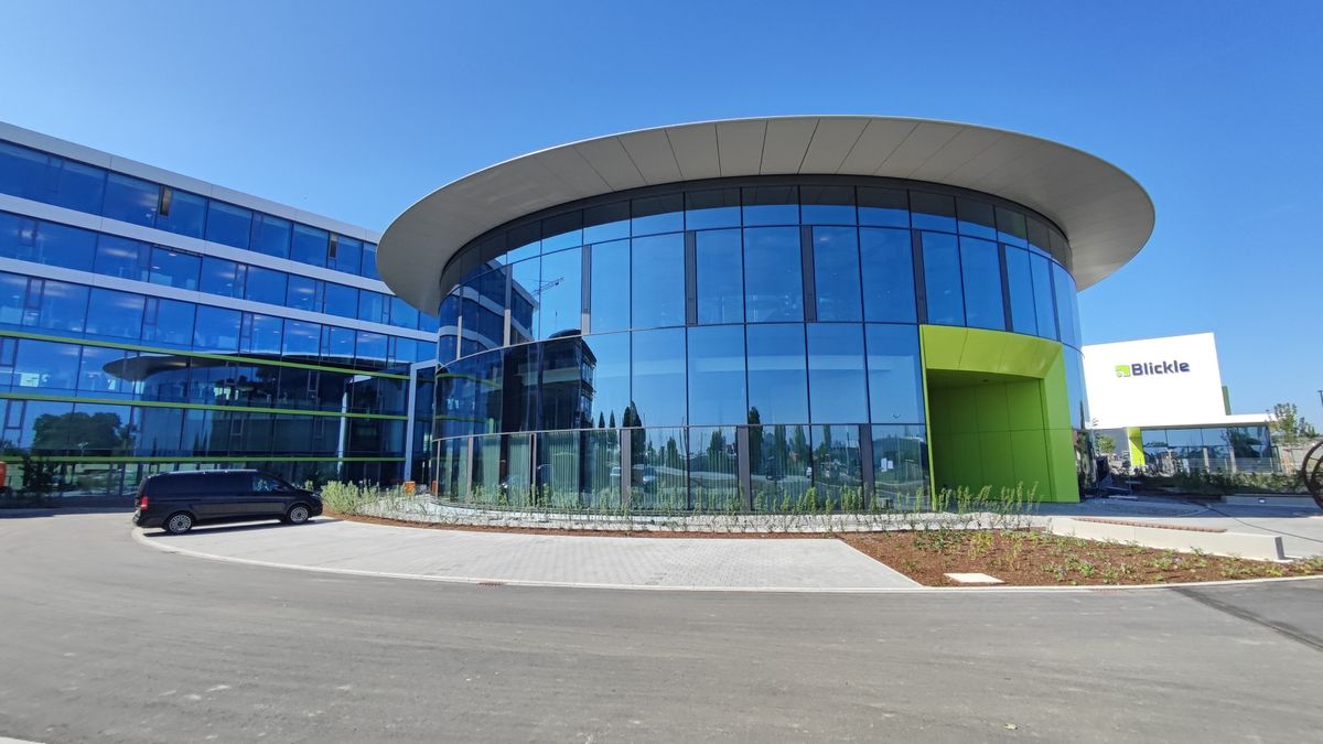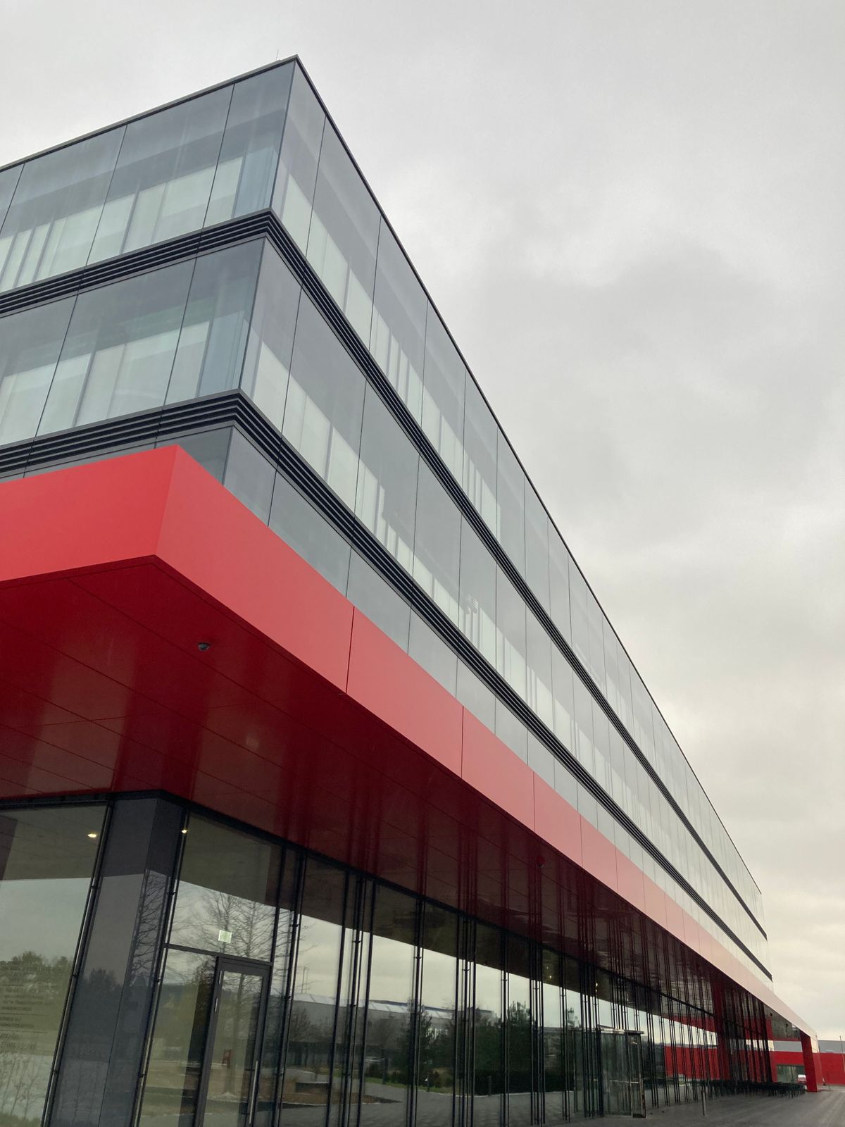 Aufgabe Ca. 2700 m² PR-Fassaden und ca. 1100 m² gebogene Scheiben am Kundencenter außen und Innenhof. Ca. 200 m² Innenfassade und ca. 200 m² wabenförmige Dachverglasung.