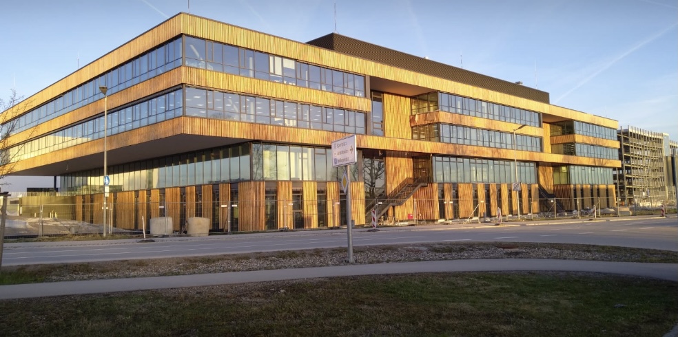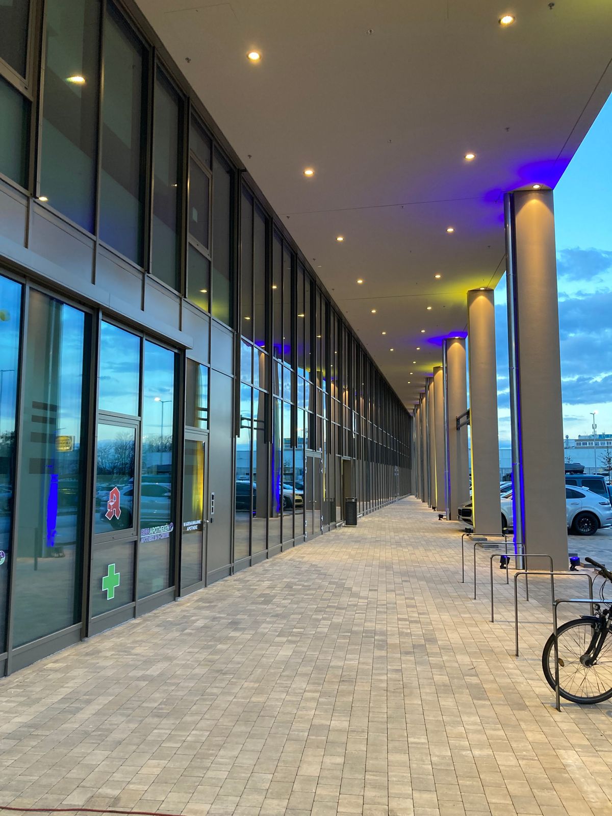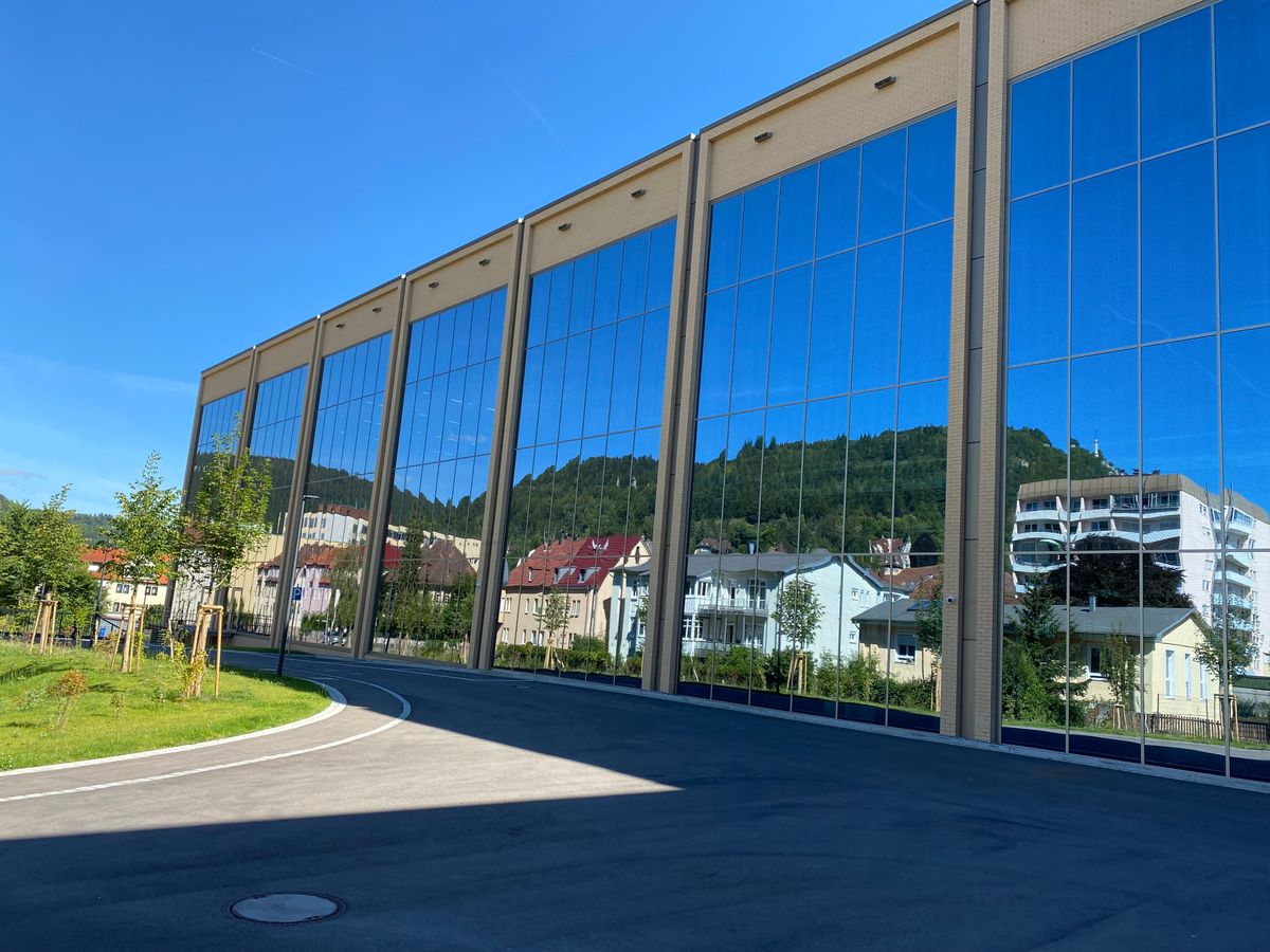Beschreibung Die gesamten ca. 3100 m² PR-Fassade mussten unter einem sich um das ganze Gebäude ziehendem Vordach montiert werden. Die Montage und Verglasung waren somit nicht mittels Krans oder Tele-Staplers realisierbar. Unser Montagekonzept mittels unter der Decke verlaufender Schienen und der Nutzung von Kettenaufzügen und Smartlift SL1008 wurde zu einem Erfolg.