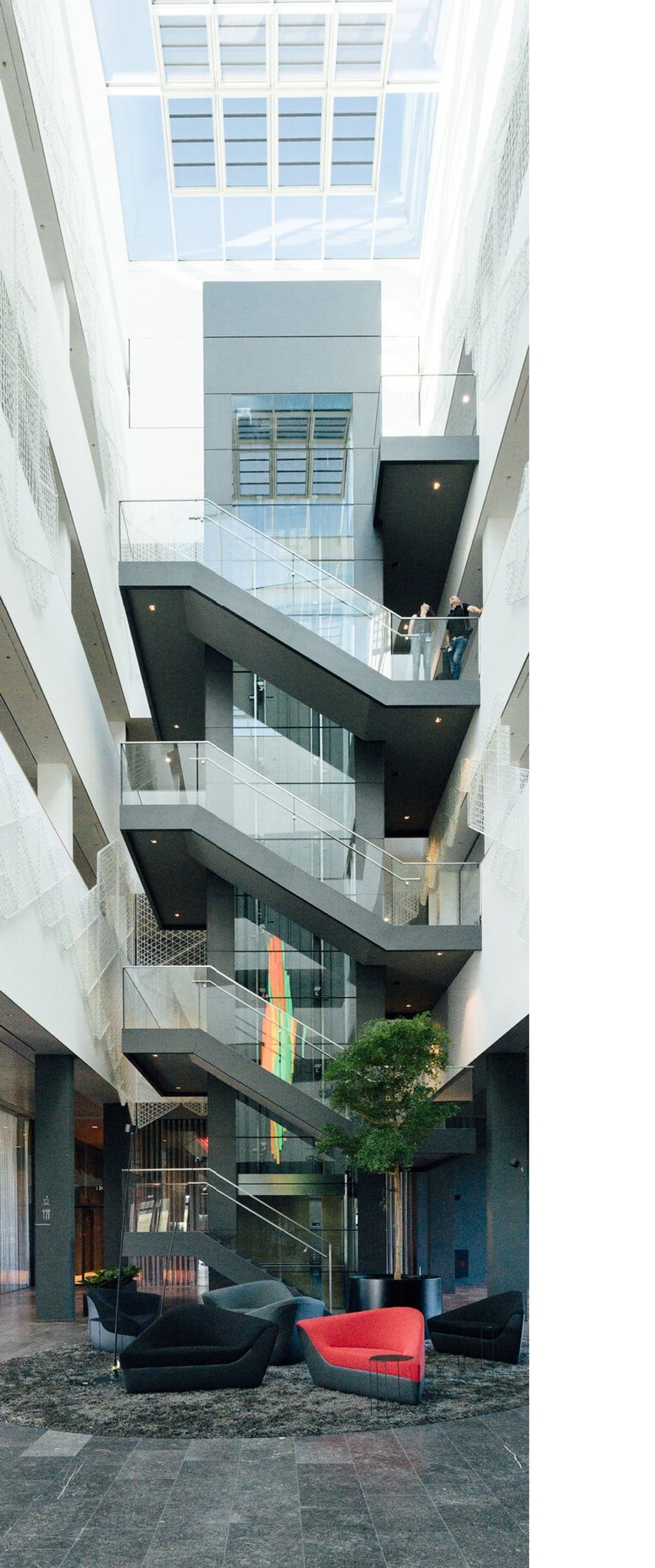 Beschreibung Im inneren befinden sich zwei Innengfassaden mit gebogenen Gläsern. Des Weiteren ein einseitig verglaster und mit Glattblech verkleideter Personenaufzug. Die Besonderheit hierbei ist, dass die Glasscheiben und die Glattblechfassade Flächenbündig in einer Linie verlaufen und eine umlaufende Treppe integriert ist. Die Gläser sind verdeckt gehalten, so dass keinerlei Befestigungen zu sehen sind.